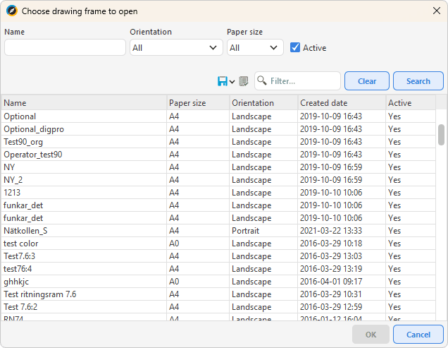 Create a new drawing frame. Enter name (mandatory), paper size, orientation and margins. |
