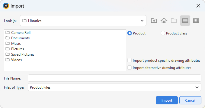 2.Select the file you want to import and indicate whether it contains product or product class. If you are importing products, you can also choose to include product-specific drawing attributes and/or alternative drawing attributes.