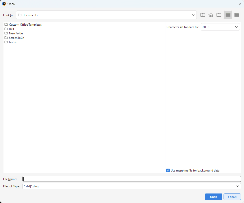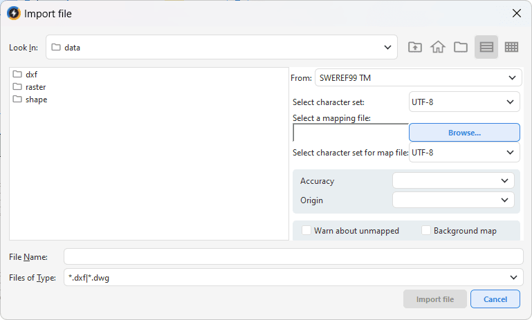 When creating or importing DXF/DWG files, you may need to select the character set for both the data file and the mapping file. This is done in the respective dialog box.