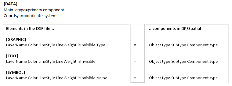 •If the DXF file uses a different coordinate system than the project in dpSpatial, this is specified in the coordsys attribute.