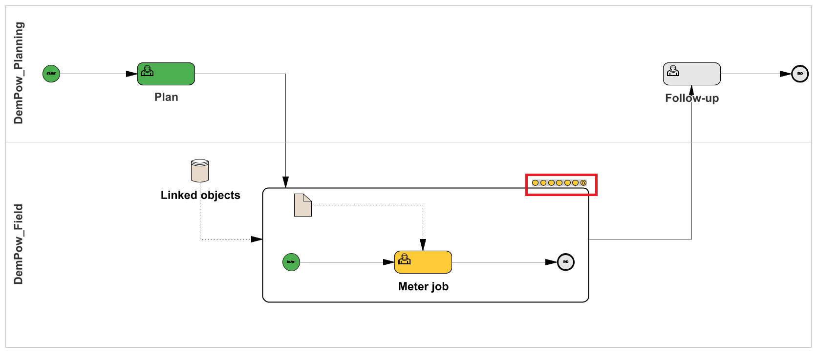 If a sub-process is present in several instances of a task, only one instance is displayed in the task view at a time. By default, the most recently started instance is shown. If multiple instances exist, this is indicated by small dots in the top right corner of the sub-process, each dot representing one instance.