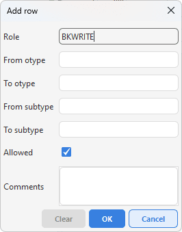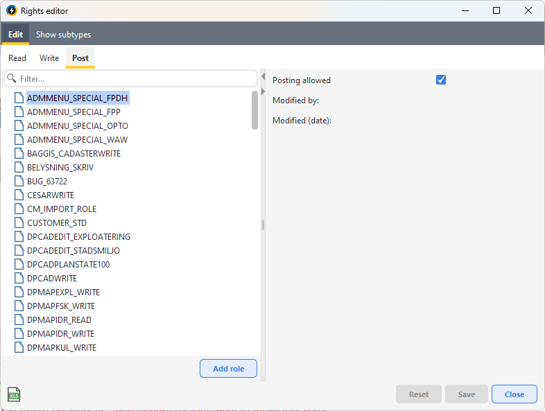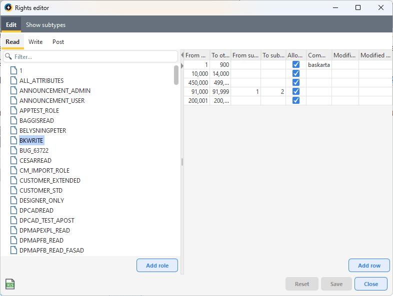 The Edit tab is used to fine-tune the rights to read, write and post. Here you edit which object types and subtypes a role has access to. If you make changes to read or write permissions, the row is marked with your name and the date of change. There are three sub-tabs: Read, Write and Post. All rights are defined in terms of ranges for object types and subtypes.