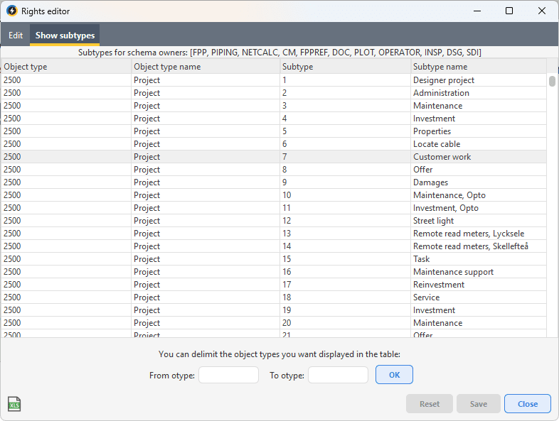 The Show subtypes tab helps you to find suitable range limits for object types and subtypes. The table shows a sortable list of object types and subtypes in the system. Both types are indicated by type number and by type name in plain text.
