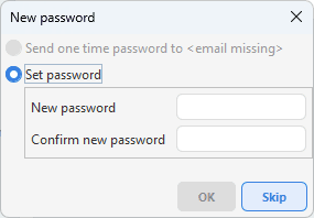 6.Enter and confirm the password, press OK. If one-time passwords are to be used, the email field must be filled in. The user is saved in the Users tab and can now log in.