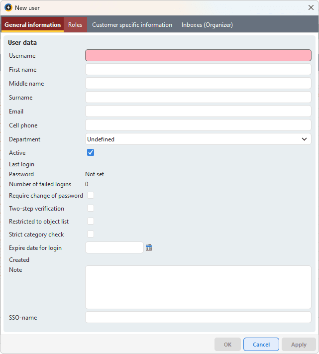 2.The fields under General information can be edited. Roles and inboxes are copied from the original user. Fields marked in pink are mandatory.