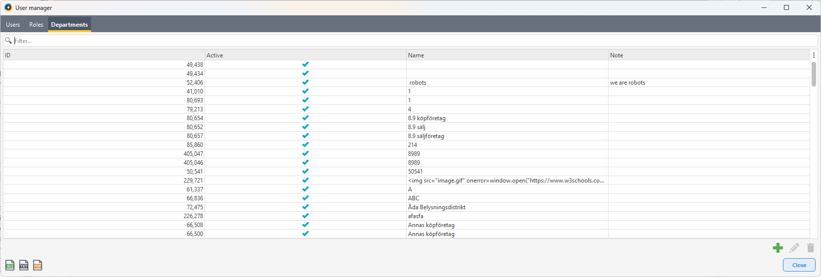 The Departments tab displays a table of all departments in the system. Here, as an administrator, you can add new departments, which can then be linked to users.