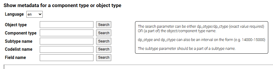 To search for an object type, enter the object type number, a range of numbers or the object name in the field and press Search. Similarly, you can view metadata for Component type, Subtype name, Codelist name and Field name.