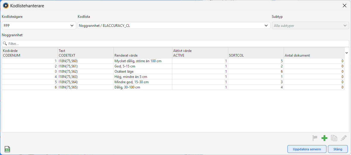 Det är även möjligt att inaktivera vissa fält i kodlistehanteraren genom konfiguration. Dessa fält kommer då inte att vara synliga i kodlistehanteraren.