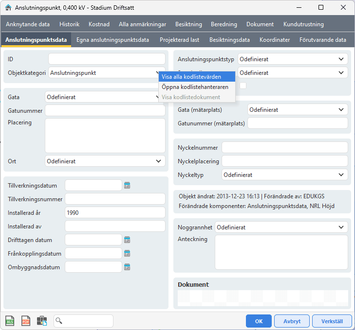 Du kan även högerklicka på pilen för en rullgardinslista och välja: •Öppna kodlistehanteraren – Redigera kodlistan direkt från attributformuläret. •Visa kodlistedokument – Öppna och granska dokument som är bifogade till en kodlista. Använd knappen Visa i fönstret som öppnas. |