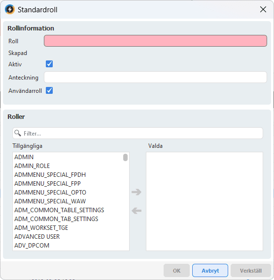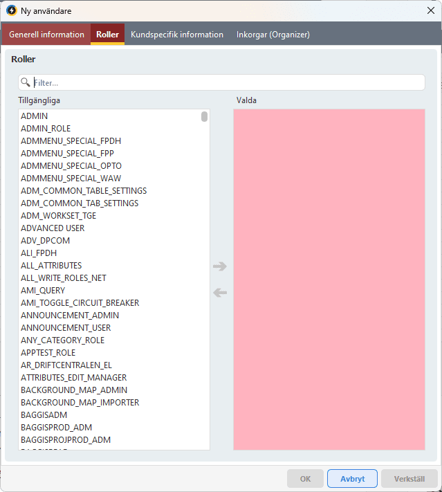3.I fliken Roller, välj de roller som användaren ska ha tillgång till. Flytta roller från listan Tillgängliga till listan Valda med pilknapparna. Håll muspekaren över en roll för mer information.