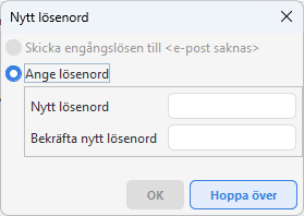 6.Ange och bekräfta lösenordet, tryck på OK. Om engångslösenord ska användas måste fältet för e-post fyllas i. Användaren sparas i fliken Användare och kan nu logga in.