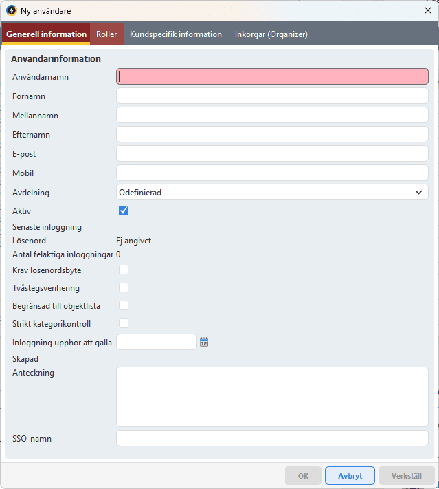 2.Fälten under Generell information kan redigeras. Roller och inkorgar kopieras från den ursprungliga användaren. Fält markerade i rosa är obligatoriska.
