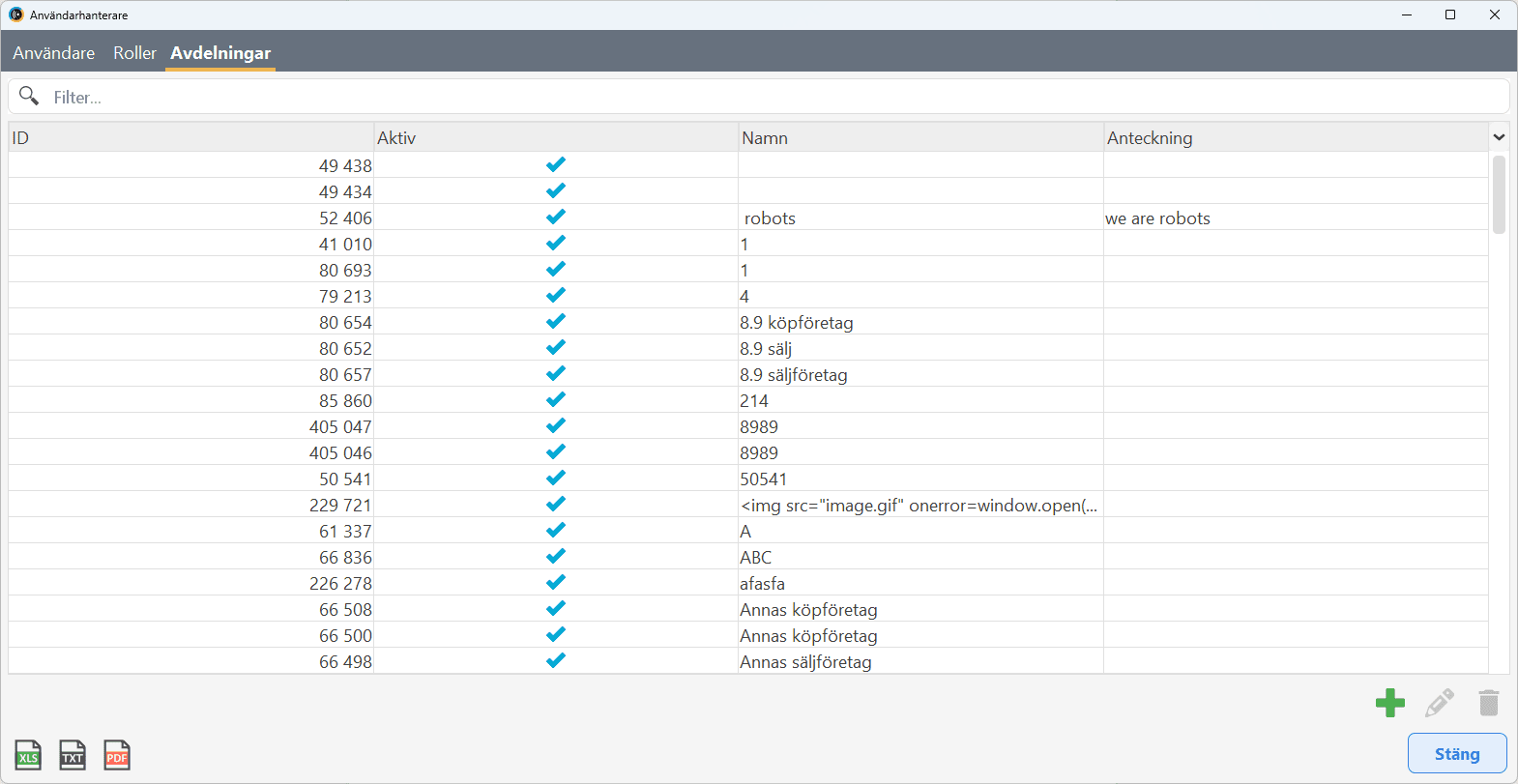 Fliken Avdelningar visar en tabell över alla avdelningar i systemet. Här kan du som administratör lägga till nya avdelningar, som sedan kan kopplas till användare.