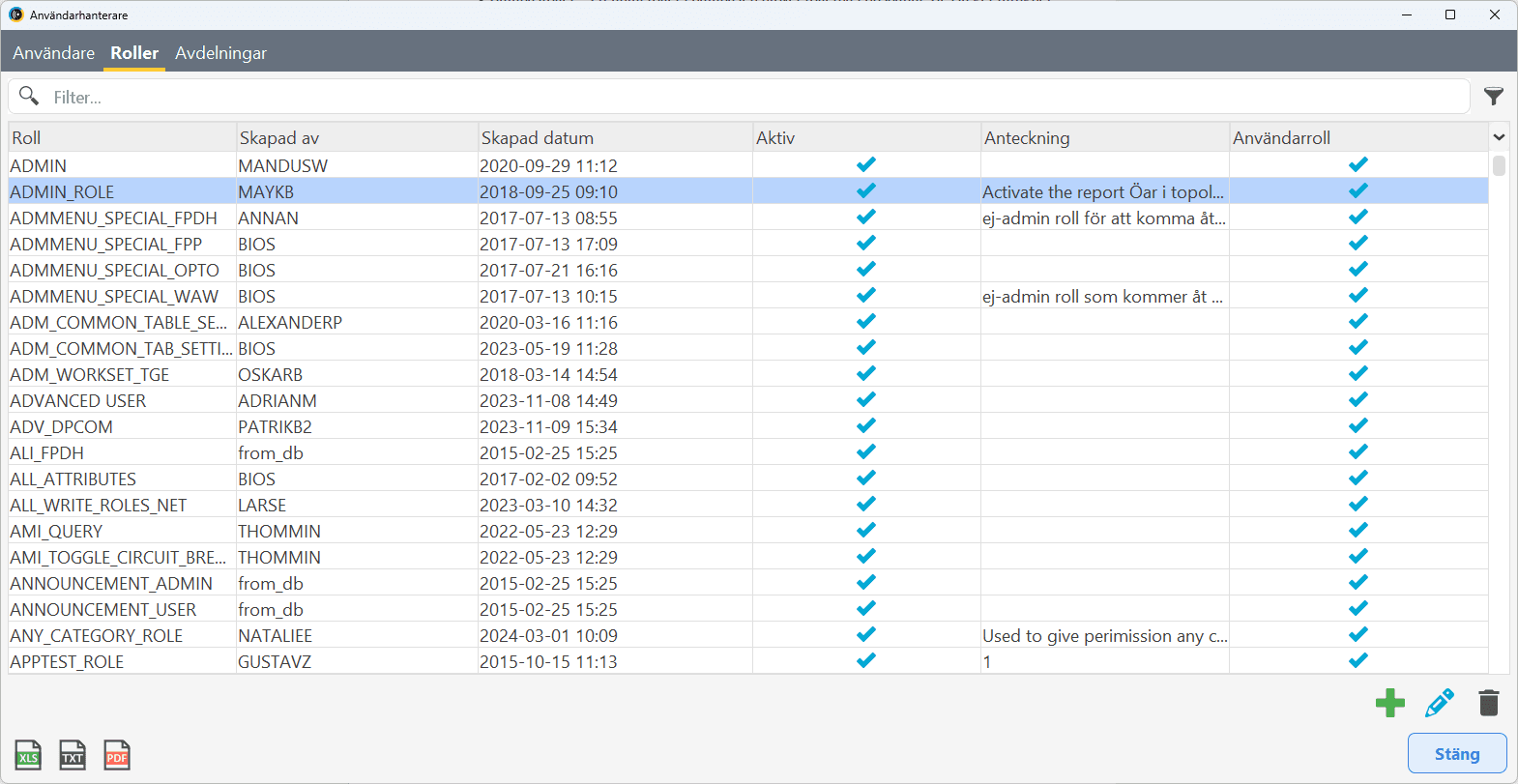 Fliken Roller visar en tabell över alla roller i systemet. Tabellen innehåller bland annat:
