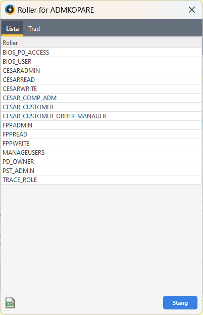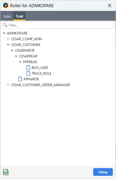 Du kan välja att visa informationen som Lista eller Träd. Vid trädvy visas även vilka roller som rollerna innehåller.
