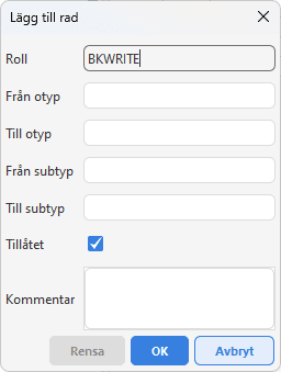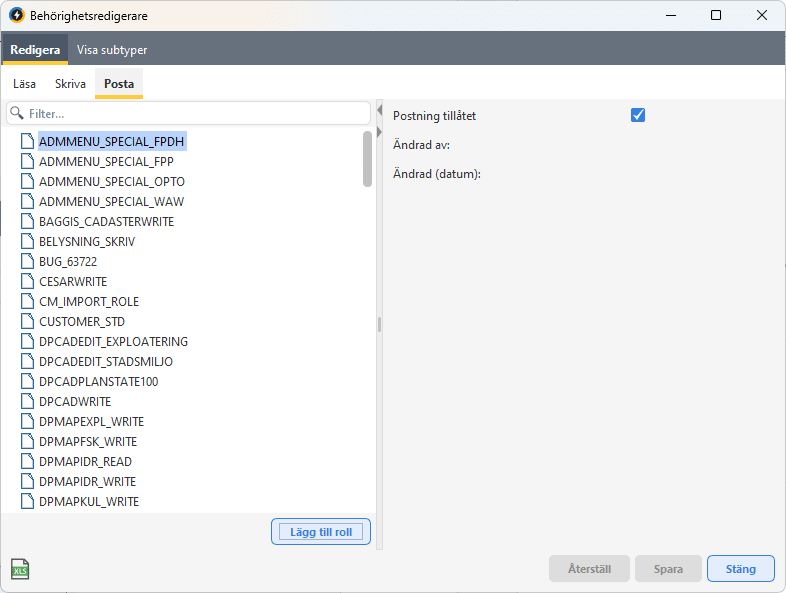 Fliken Redigera används för att finjustera rättigheterna att läsa, skriva och posta. Här redigerar du vilka objekttyper och subtyper en roll har behörighet till. Om du gör ändringar av läs eller skrivrättigheter markeras raden med ditt namn samt ändringsdatum. Det finns tre underflikar: Läsa, Skriva och Posta. Alla rättigheter definieras i form av intervall för objekttyper och subtyper.