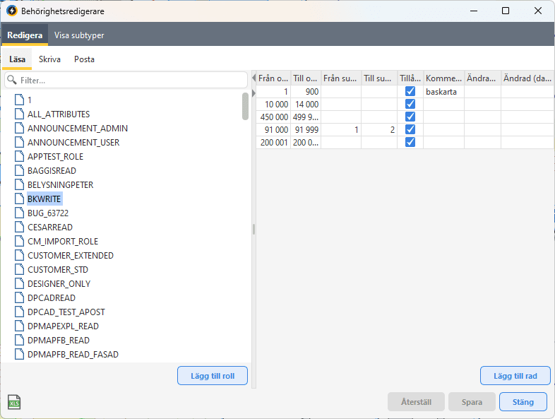 Till höger visas de olika rollernas aktuella läs-, skriv- respektive postningsrättigheter inom intervall av objekttyper och subtyper.