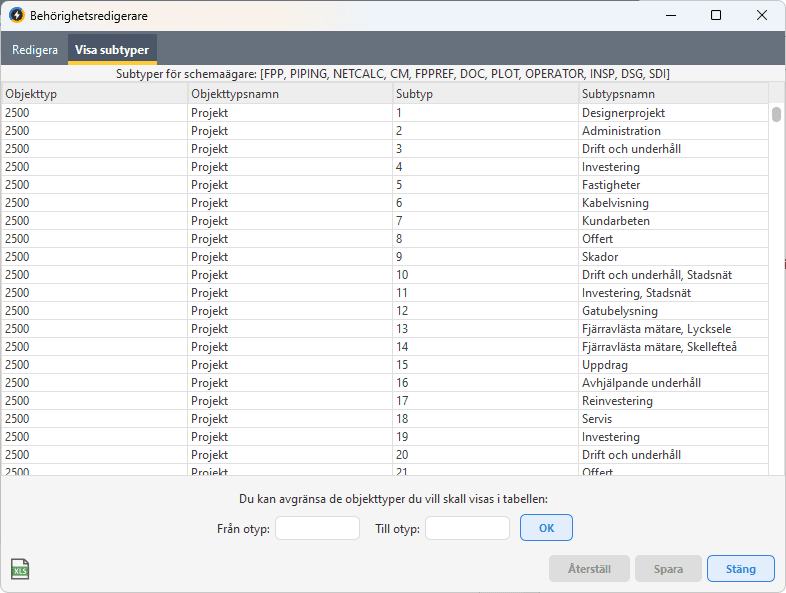 Under fliken Visa subtyper kan du få hjälp att hitta passande intervallgränser för objekttyper och subtyper. I tabellen visas en sorterbar lista över objekttyper och subtyper i systemet. Båda typerna angivs med typnummer och med typnamn i klartext.