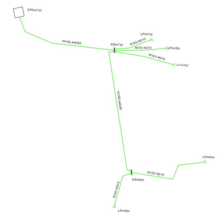 2.Placera Serviskabel luft, 0,400 kV till alla anslutningspunkter, använd Placering Mellan knutpunkter och välj lämplig ledningstyp.
