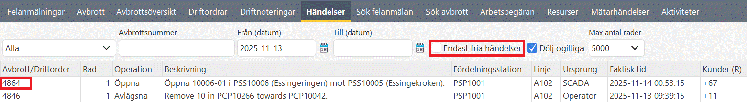 1.Välj avbrottet (eller driftordern) där händelsen just nu finns.