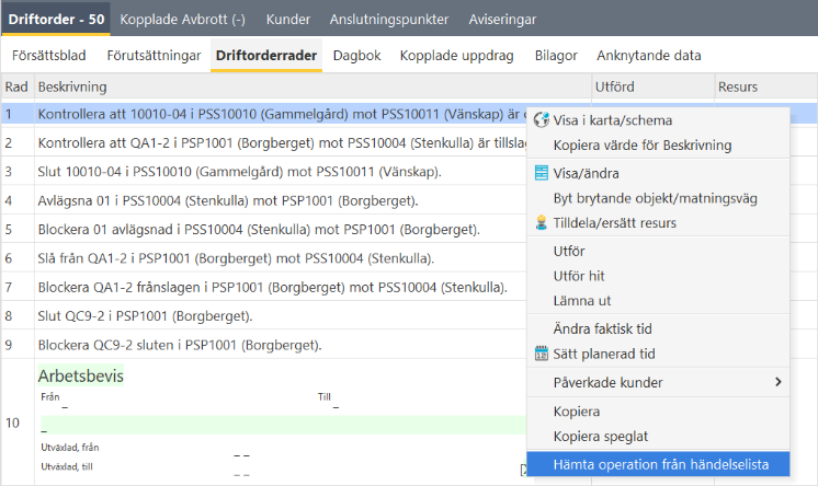 1.Högerklicka på den planerade raden och välj Hämta operation från händelselista. Förutsatt att den senaste operationen utgör den enda kopplingsraden i det oönskade avbrottet, flyttas operationen till markerad plats och det oönskade avbrottet förklaras ogiltigt.