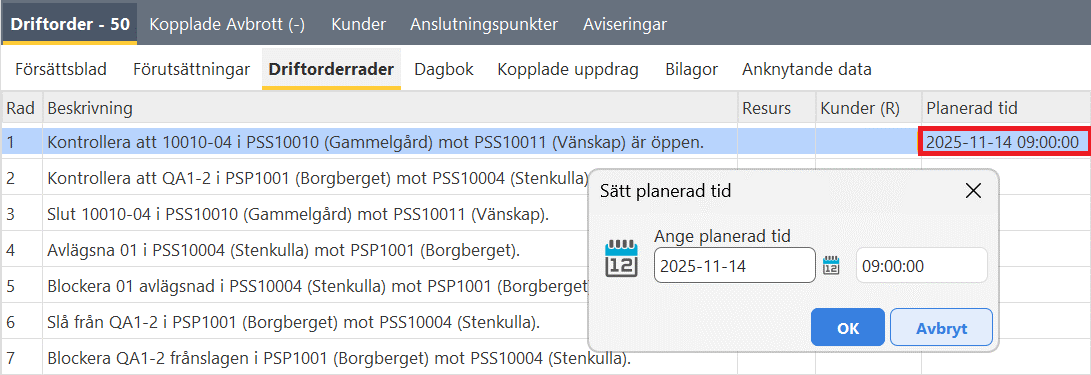 •För driftordrar med särskild kundkonfiguration (behöver beställas): tidstämpeln ligger inom tidsintervallet för arbeten, kopplingstider och/eller avbrottstider.