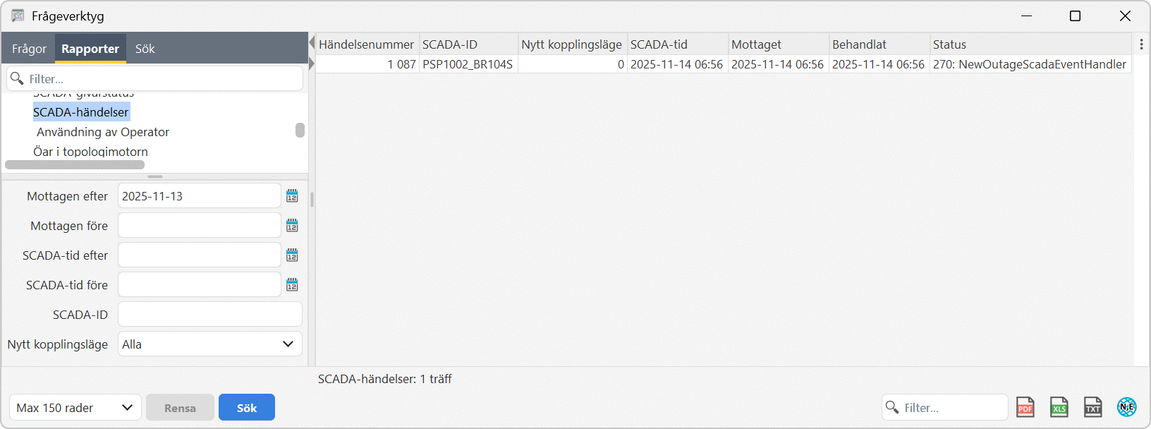 1.I frågeverktyget, flik Rapporter, välj Operator > SCADA-händelser.