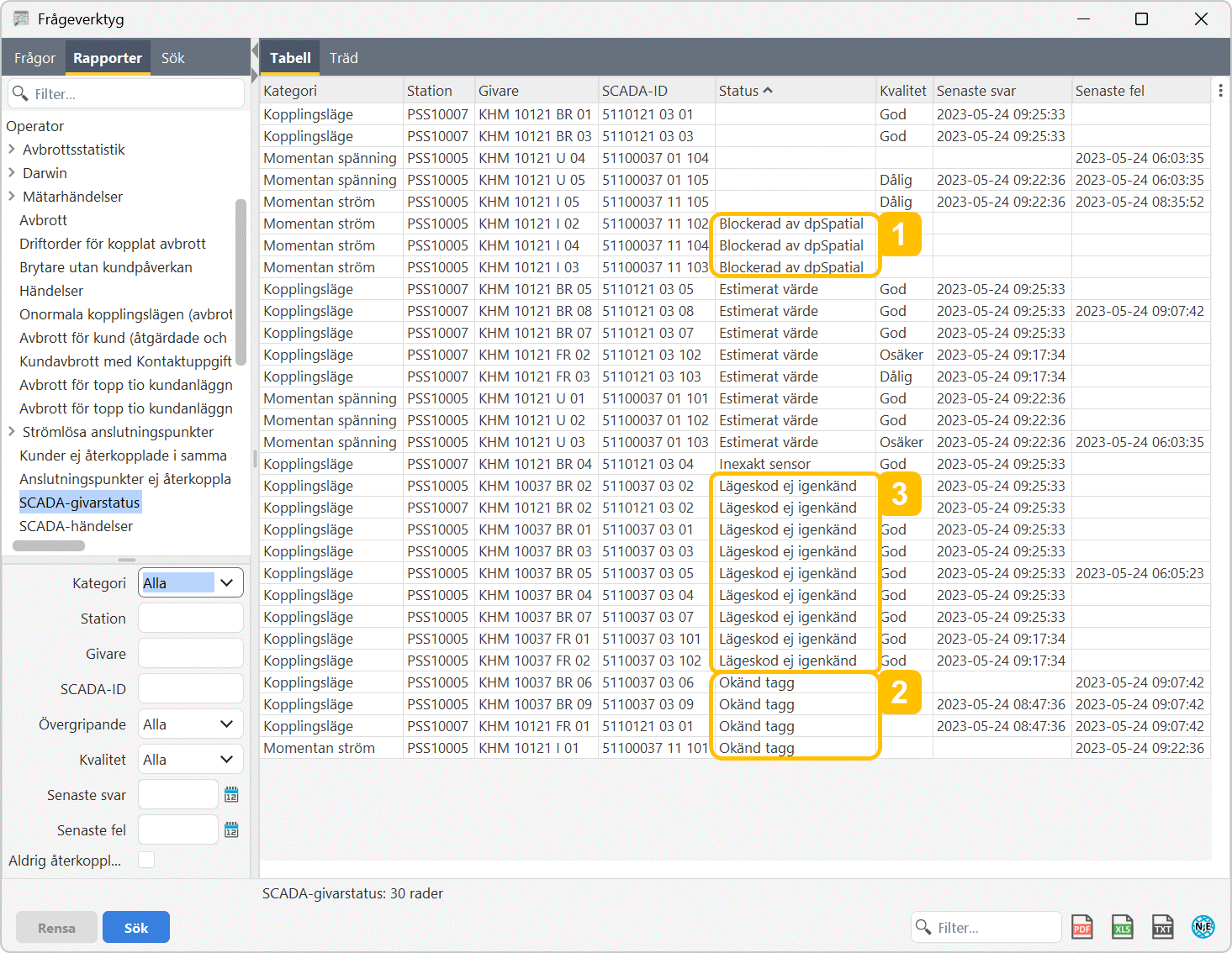 Frågeverktygets rapport Operator > SCADA-givarstatus är ett effektivt sätt att undersöka enskilda apparaters status.