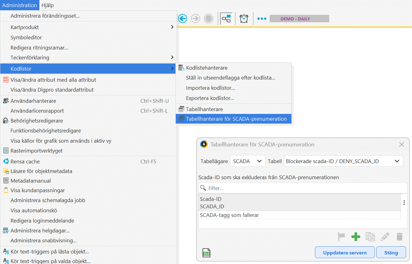 1.Välj Administration > Kodlistor > Tabellhanterare för SCADA-prenumeration.