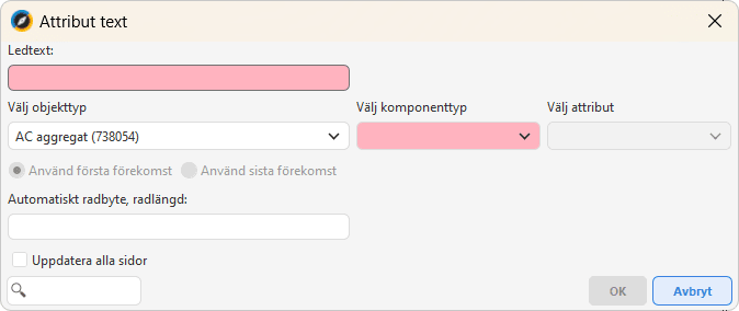 Om en attributtext är inlagd i en placerad ritningsram, syns denna i kartan. Det går då att dubbelklicka på attributtexten och en funktion för välj objekt i kartan startas. Du kan välja de objekt i kartan som stämmer överens med det som definierades i ritramseditorn. Attributtexten kopplas till ett objekt samt till ritningsramen. Det går att peka ihop attributlänkad text i ritningsramen med ett objekt. Alla texter i ritningsramen som har attributlänkad text till samma dp_otype uppdateras. Attributlänkade texter med samma dp_otype och oid som vald geometri när fri plottning startades fylls automatiskt i om användaren placerar en ritningsram med attributlänkade fält för samma dp_otype. |